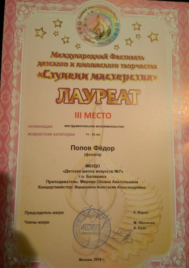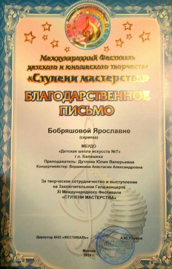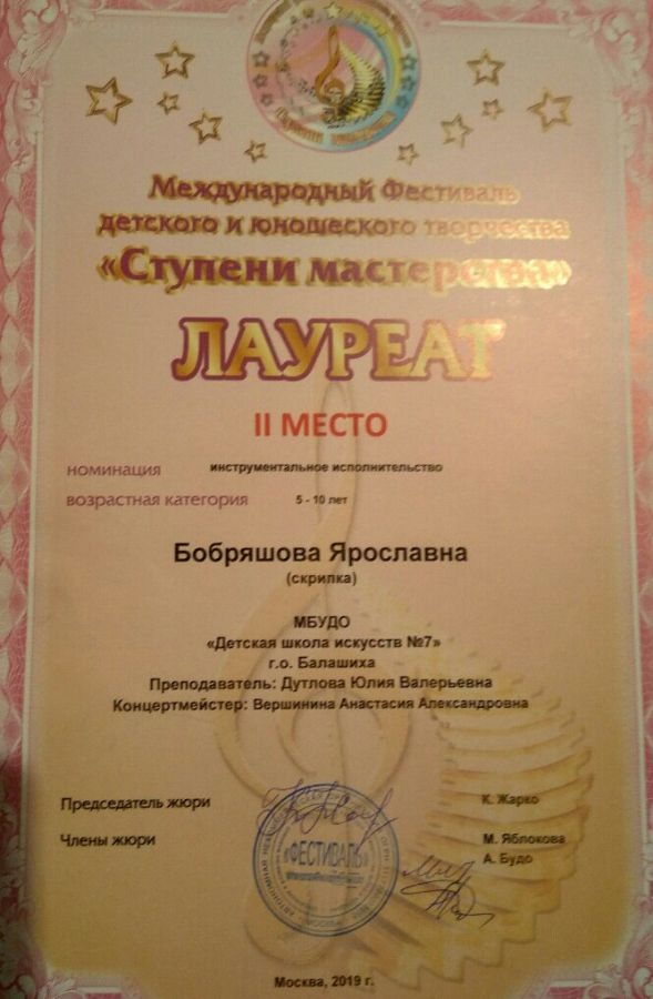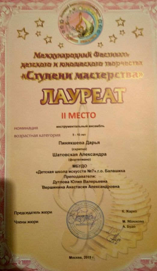 С 28 по 31 мая 2019 года, в г. Москва проходил Международный фестиваль детского и юношеского творчества "Ступени мастерства -2019", в котором с успехом приняли участие и стали победителями, учащиеся оркестрового отделения нашей ДШИ. Бобряшова Ярославна - лауреат 2 степени, Попов Федор (преп. - Мирная К.А., конц. - Вершинина А.А.) - Лауреат 3 степени, инструментальный ансамбль (преп. - Дутлова Ю.В. и Вершинина А.А.) - Пинякшева Дарья и Шатовская Алексанндра - Лауреаты 2 степени, Марыгина Ксения (преп. - Дутлова Ю.В, конц. - Вершинина А.А.) - дипломант.