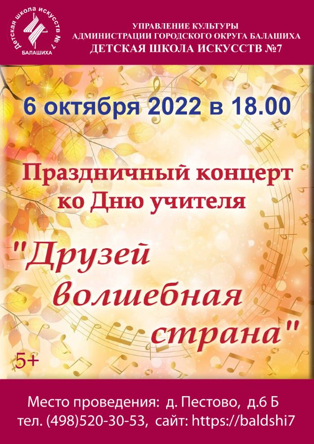 День учителя - один из самых важных праздников в школах. Преподаватели–наставники передают юным музыкантам не только знания и умения, но и радость творчества от выступлений на сцене, конкурсах и фестивалях; вместе переживают победы и поражения. В день своего профессионального праздника преподаватели школы искусств принимают музыкальные поздравления от своих учеников. Яркие оригинальные и веселые номера, в исполнении учащиихся. Приглашаем всех в Концертный зал ДШИ № 7, 6 октября на Концерт ко Дню учителя «Друзей волшебная страна».