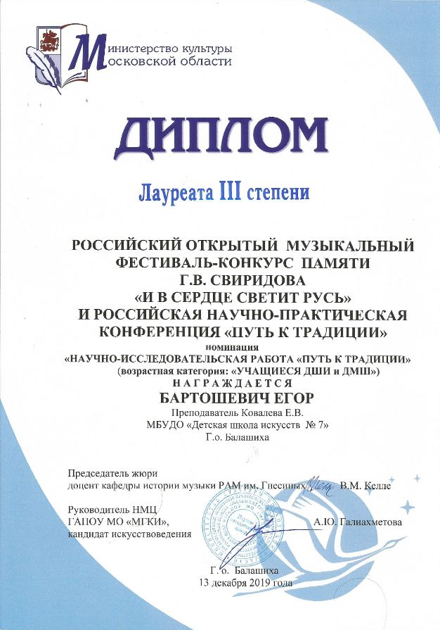 13 декабря 2019 года в ДШИ №1 имени Г.В. Свиридова прошла Российская научно-практическая конференция "Путь к традиции" в рамках фестиваля-конкурса памяти Г.В. Свиридова "И в сердце светит Русь". Прекрасным подарком для всех участников конференции стала творческая встреча с всемирно известным музыкантом Михаилом Аркадьевым, который рассказал о работе с Г. Свиридовым, показал фрагменты любительской съёмки композитора, играл его музыку. После завершения встречи были объявлены результаты конкурса исследовательских работ среди учащихся и преподавателей ДШИ. Поздравляем Бартошевича Егора (7 класс) и его преподавателя Е.В. Ковалеву со званием Лауреата III степени!